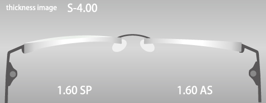 厚度比較圖是左前角折射率為1.60的球面設計鏡片和右面折射率為1.60的非球面設計鏡片的圖像,基於根據以下數據計算出的數值創建。
