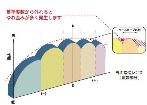 在以往的外表面漸進鏡片中,由於表面含有漸進成分,所以曲線不是平衡的,如果在進行倍率放大時內面偏離基準曲線,則會產生像散(變形的原因)。