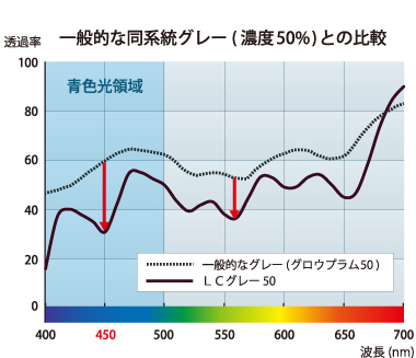LCD50太陽鏡顏色是一種特殊的顏色,旨在顯著減少450nm左右的波長,在該波長下,藍色光最為強烈。由於同時減少了容易察覺眩光的560nm附近的黃光,因此即使與相同濃度的顏色相比,也可顯著提高抑制眩光的效果。