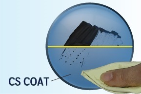 該膜層改善了鏡片表面的撥水性。氟膜的改善可驅除水和油,使灰塵難以附著(圖②)。