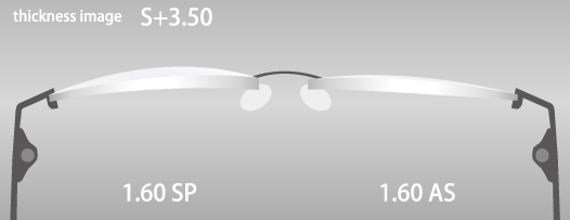 厚度比較圖是左前角折射率為1.60的球面設計鏡片和右面折射率為1.60的非球面設計鏡片的圖像,基於根據以下數據計算出的數值創建。