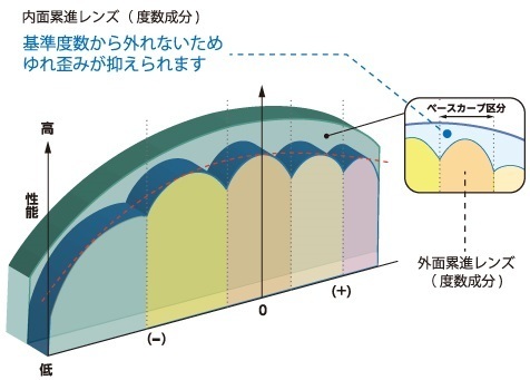 另一方面,FFi系列的內面漸進鏡片具有平衡的表面曲線。內面的漸進設計不會受到表面曲線的任何干擾,因此設計的自由度增加了,並且精度提高了。