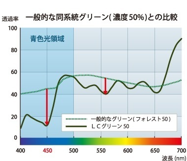 LCD50太陽鏡顏色是一種特殊的顏色,旨在顯著減少450nm左右的波長,在該波長下,藍色光最為強烈。由於同時減少了容易察覺眩光的560nm附近的黃光,因此即使與相同濃度的顏色相比,也可顯著提高抑制眩光的效果。