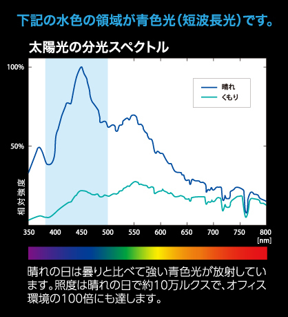 隨著PC和3C手機的普及,人們已經認識到LCD屏幕發出的藍光(藍光/短波長光 / 380nm至500nm區域)的影響,但實際上自然是自然的但是,其中包括藍光,晴天時來自太陽的輻射量是辦公室環境的100倍。