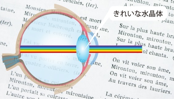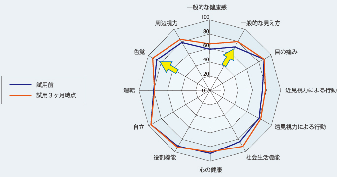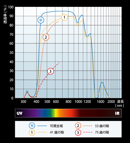 由於可以精確地阻隔感覺最刺眼的585nm附近的波長(黃光),因此可以清晰地看到紅色和綠色,並且可以恢復老年人視野中的美麗色彩。