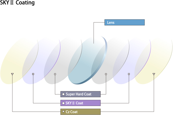 SKYⅡ膜層可有效減少藍光,其特徵是柔和的藍紫色反射色,建議用於那些擔心眼睛疲勞的人。